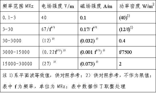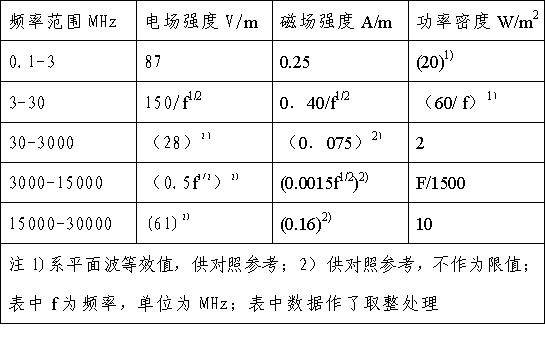 4、對于脈沖電磁波,除滿足上述要求外,其瞬時峰值不得超過表中1、2所列限值的1000倍。